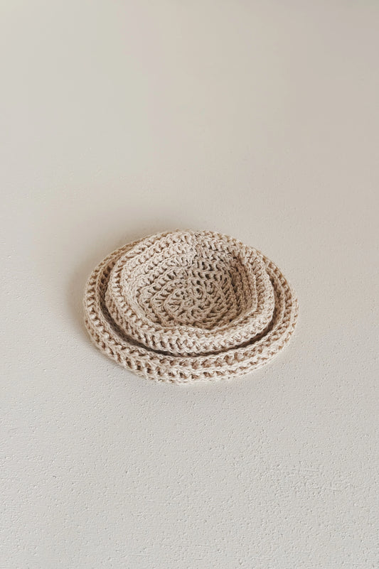 BONNET CROCHETÉ MAIN JAN-JAN VAN ESSCHE EN FIL DE LIN ET DE COTON BLANC CASSÉ