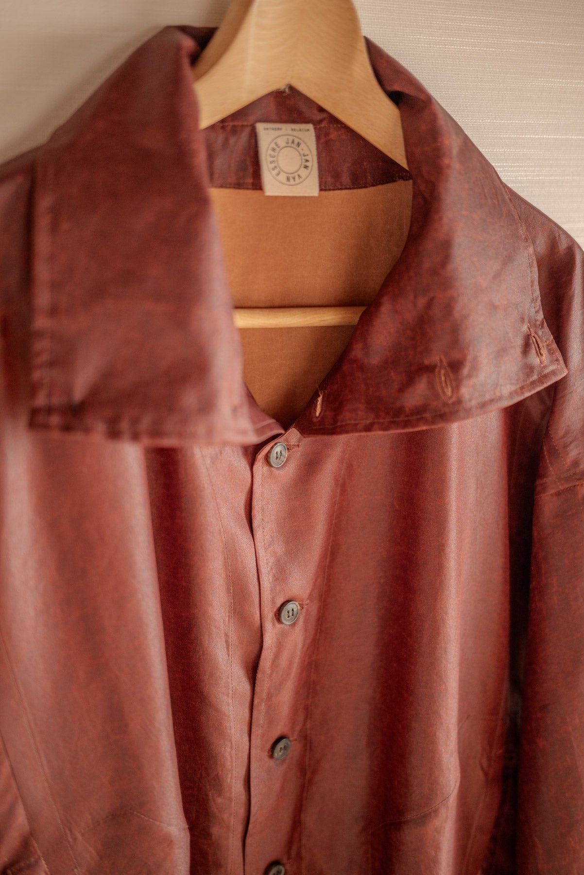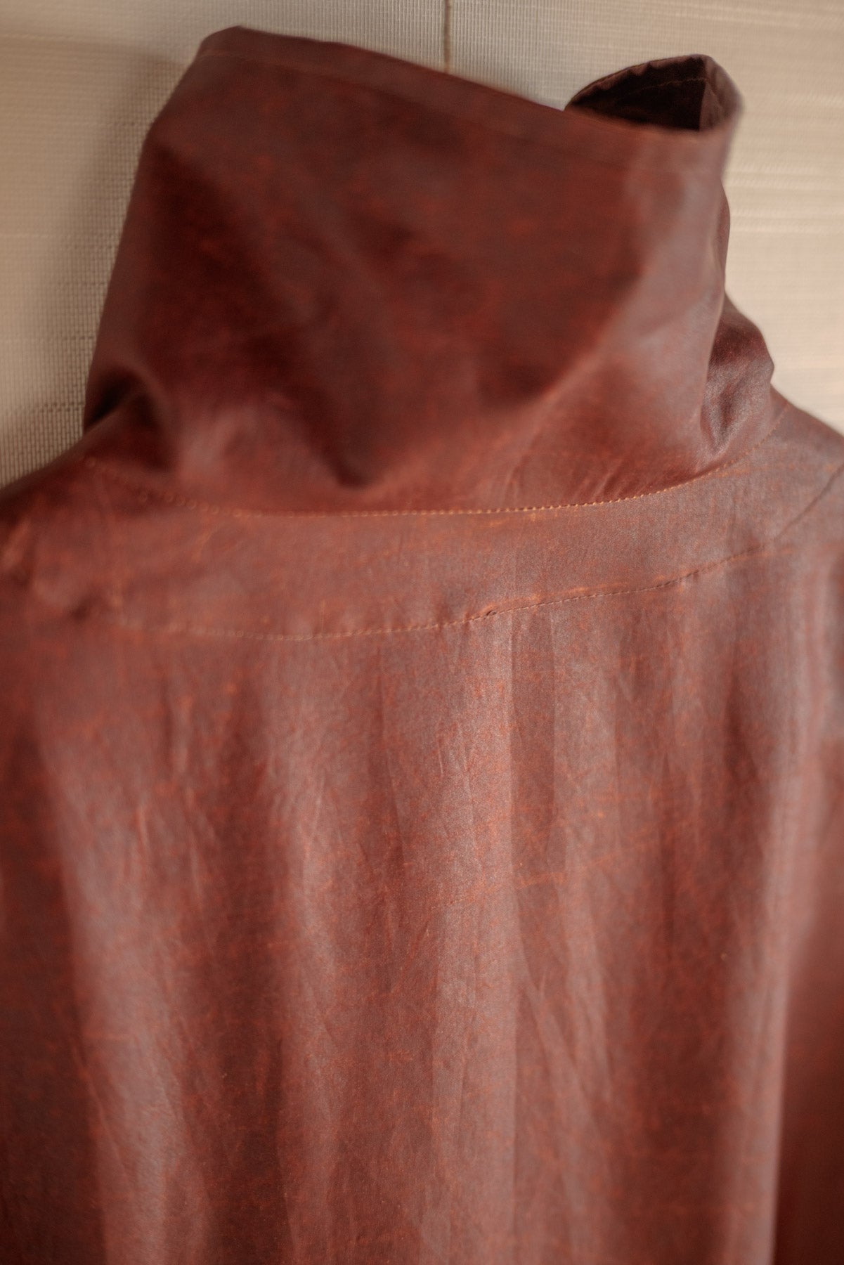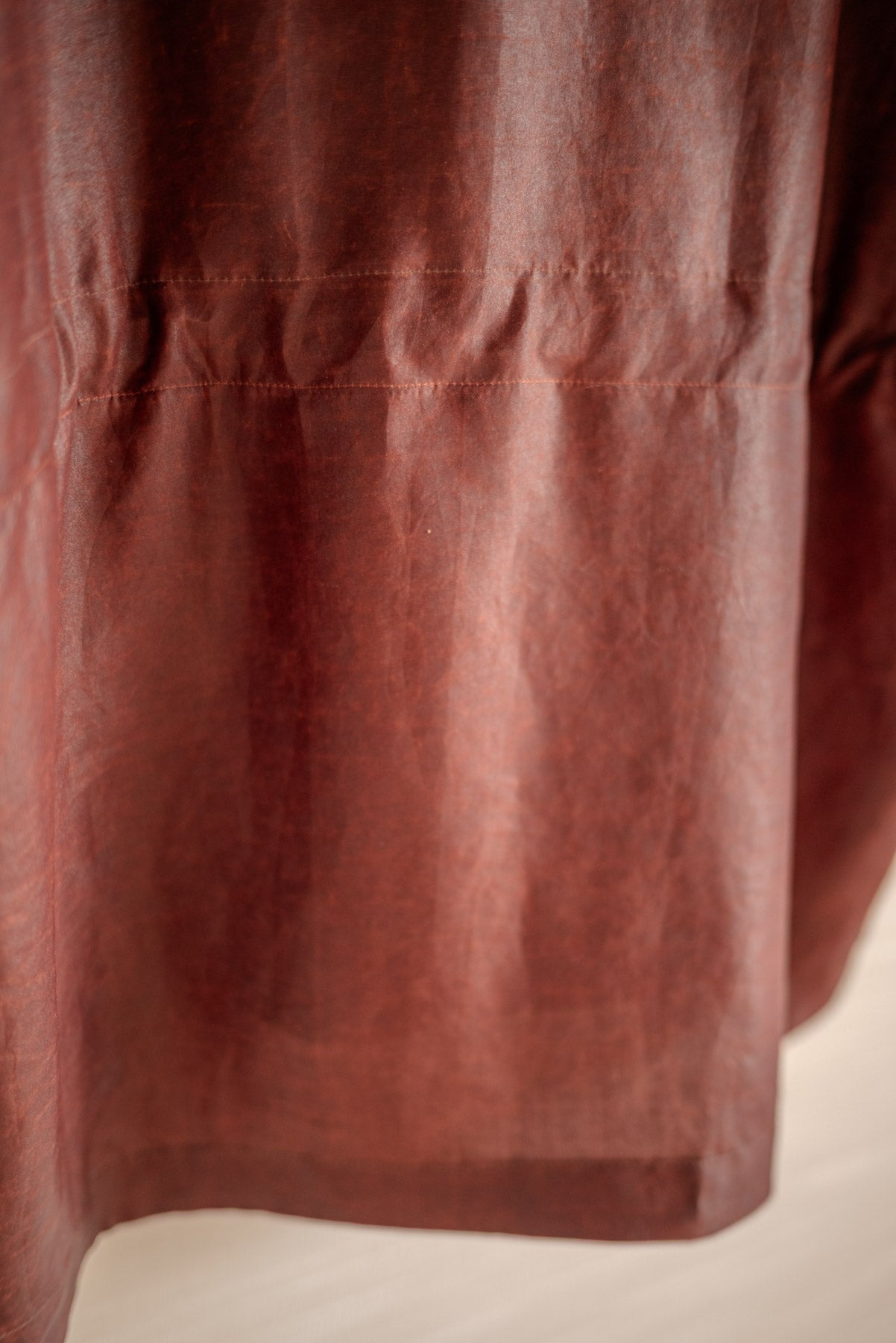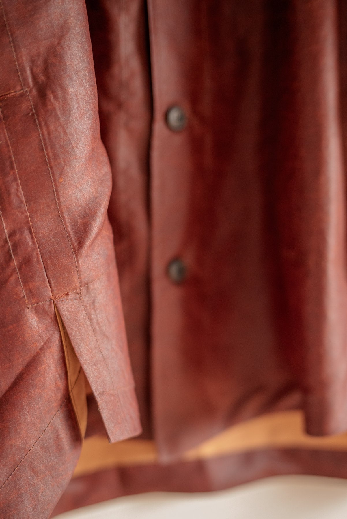タンニンを豊富に含む「薯莨(シュリャン)」の樹液で幾度も染め重ね、広い野外で陽光に晒しながら酸化を繰り返し、さらに鉄分を含む川の泥と反応させるという手間のかかるプロセスを経て、深みのあるオックスブラッドの色彩とわずかに金属的な光沢が生まれます。