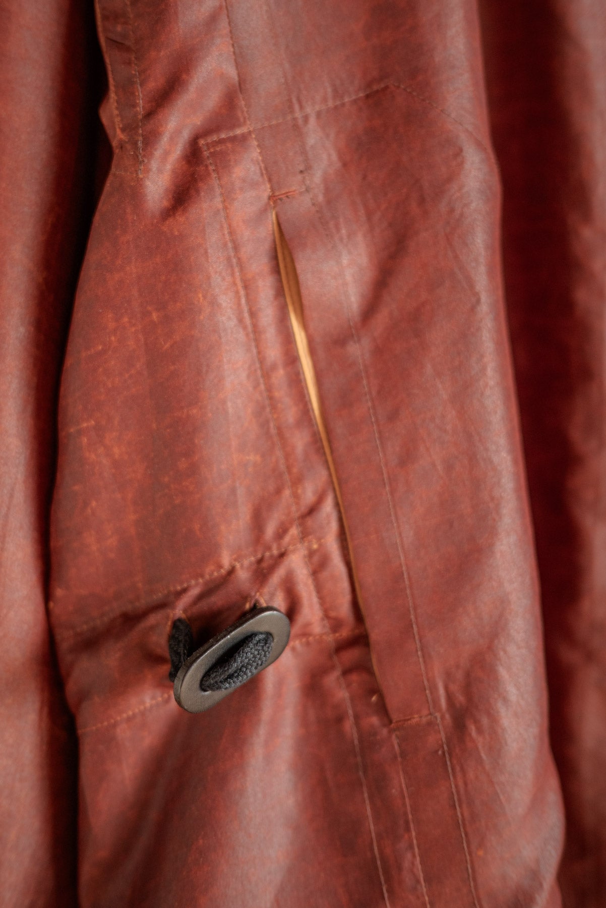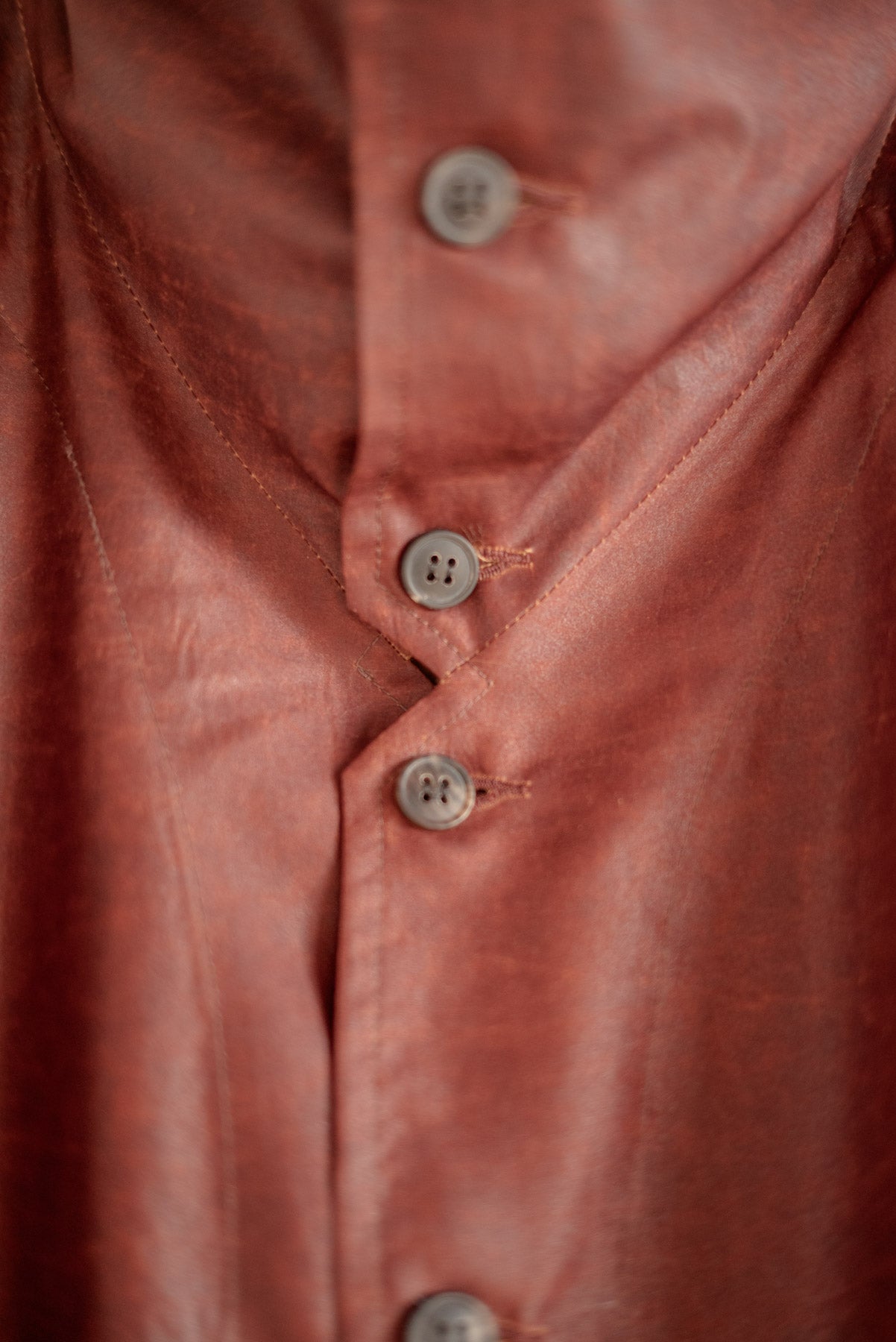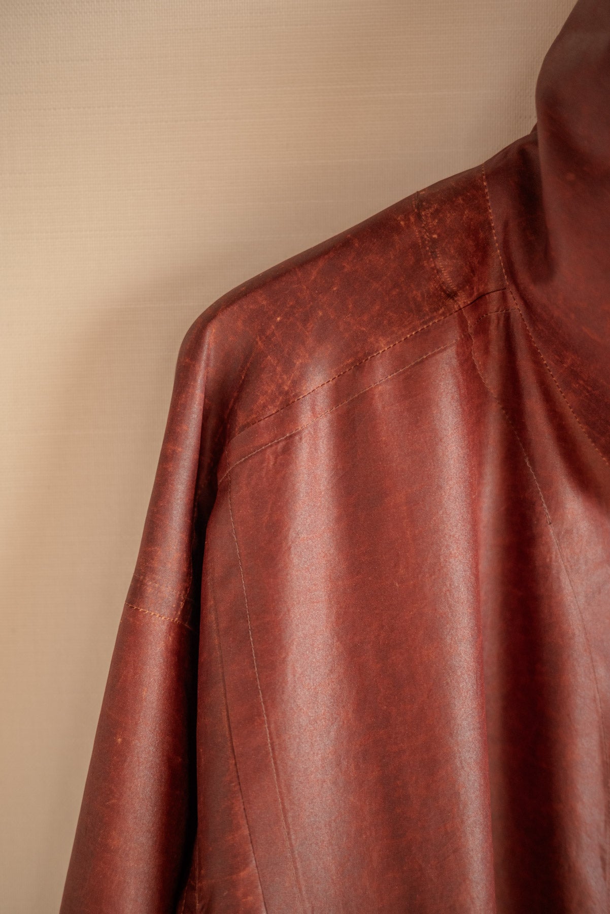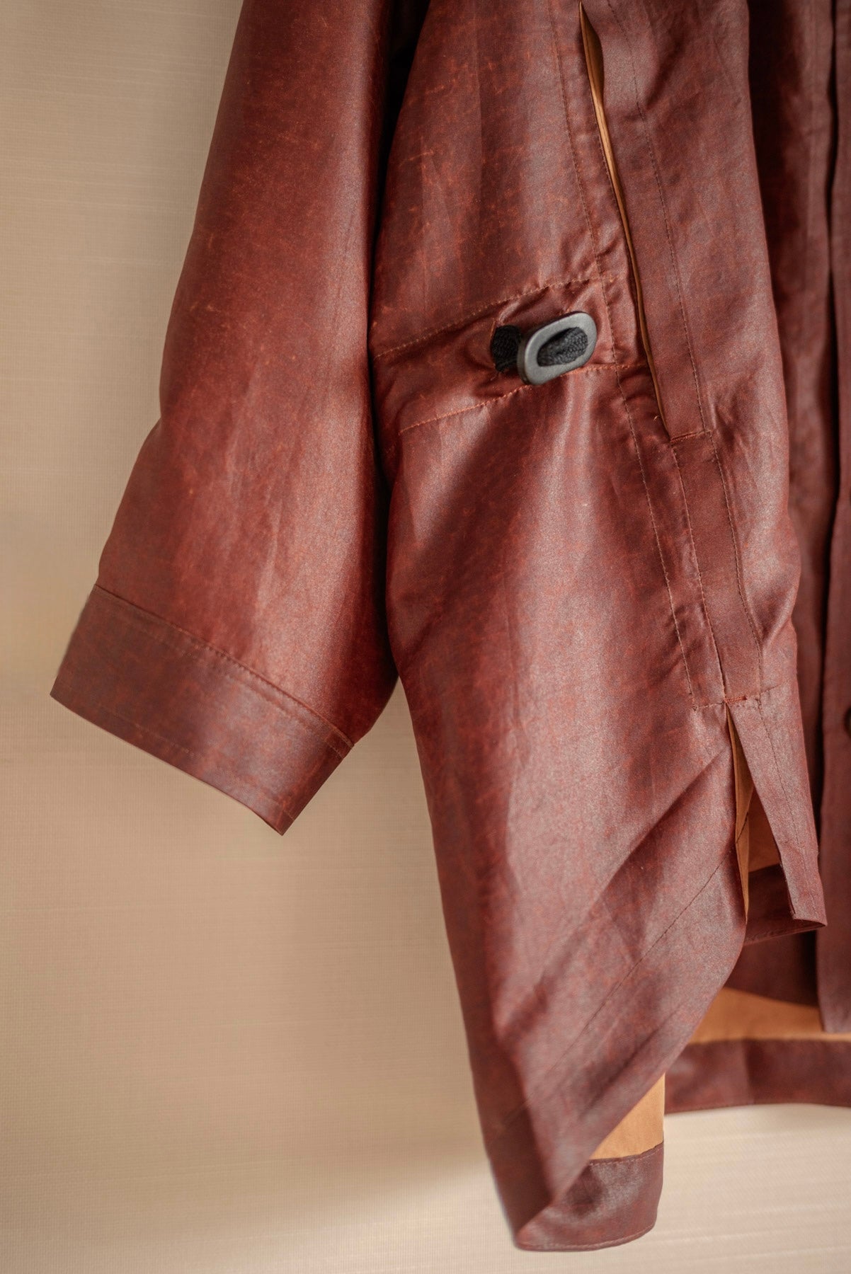 タンニンを豊富に含む「薯莨(シュリャン)」の樹液で幾度も染め重ね、広い野外で陽光に晒しながら酸化を繰り返し、さらに鉄分を含む川の泥と反応させるという手間のかかるプロセスを経て、深みのあるオックスブラッドの色彩とわずかに金属的な光沢が生まれます。
