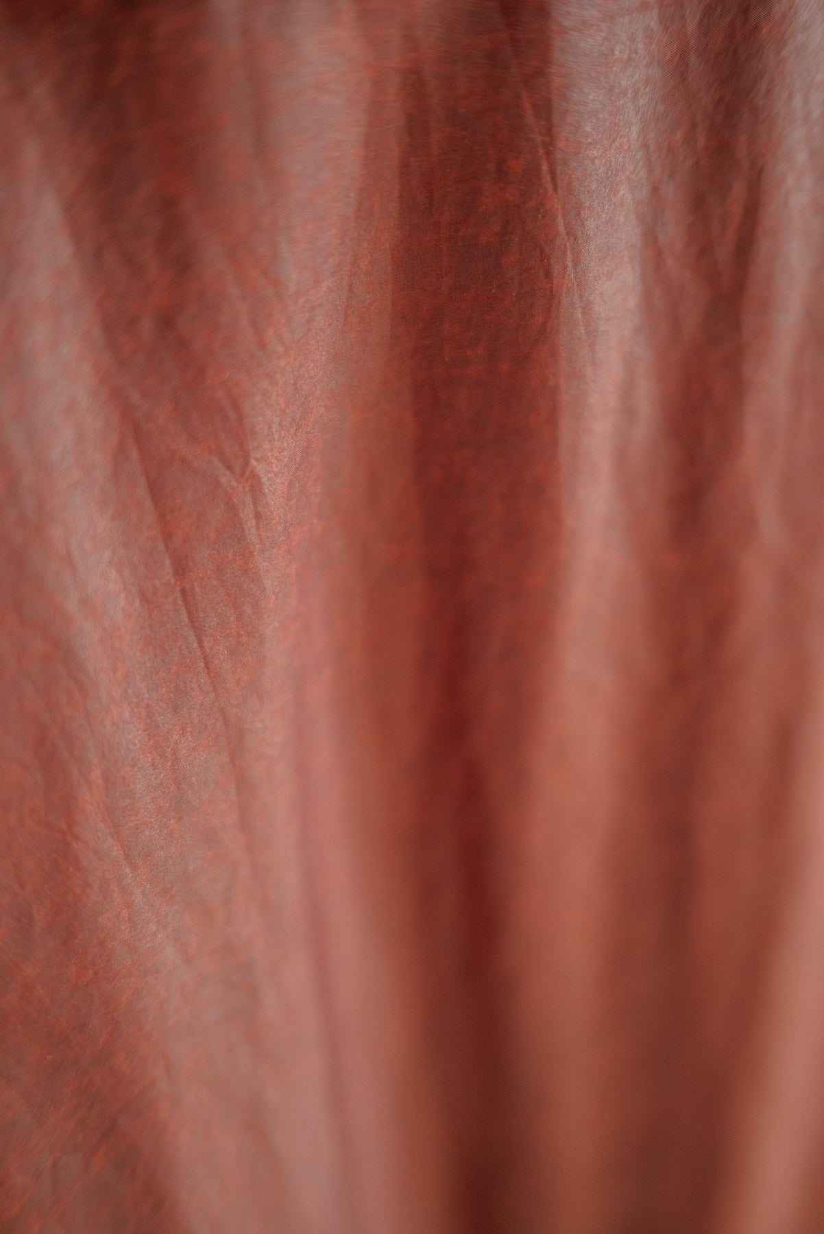 A TRADITIONAL FABRIC FROM SOUTHERN CHINA OF SILK THAT HAS GONE THROUGH AN ELABORATE PROCESS OF NATURAL DYEING AND OXIDATION, LENDING IT A METALLIC SHEEN. THE MEASURED PROCESS INVOLVES DYEING THE FABRIC REPEATEDLY WITH THE TANNIN-RICH YELLOW AND RED JUICE OF THE LOCAL SHULIANG YARN AND EXTENSIVE SUN EXPOSURE ON OPEN FIELDS.