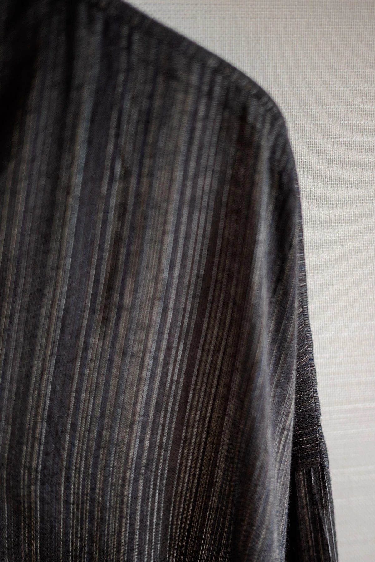 異なる太さと色の糸が織りなす洗練されたパターンは、動くたびに豊かな表情と奥行きを生み出します。