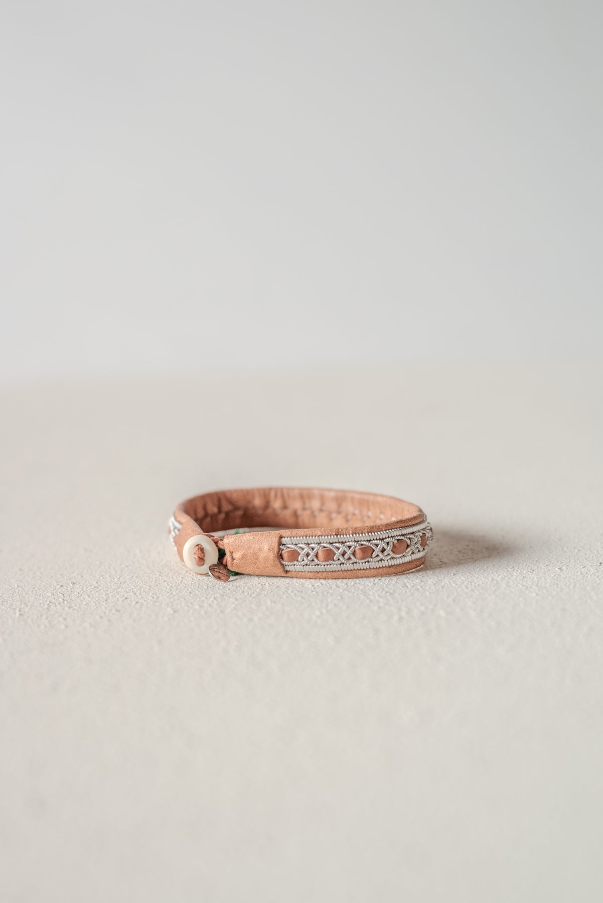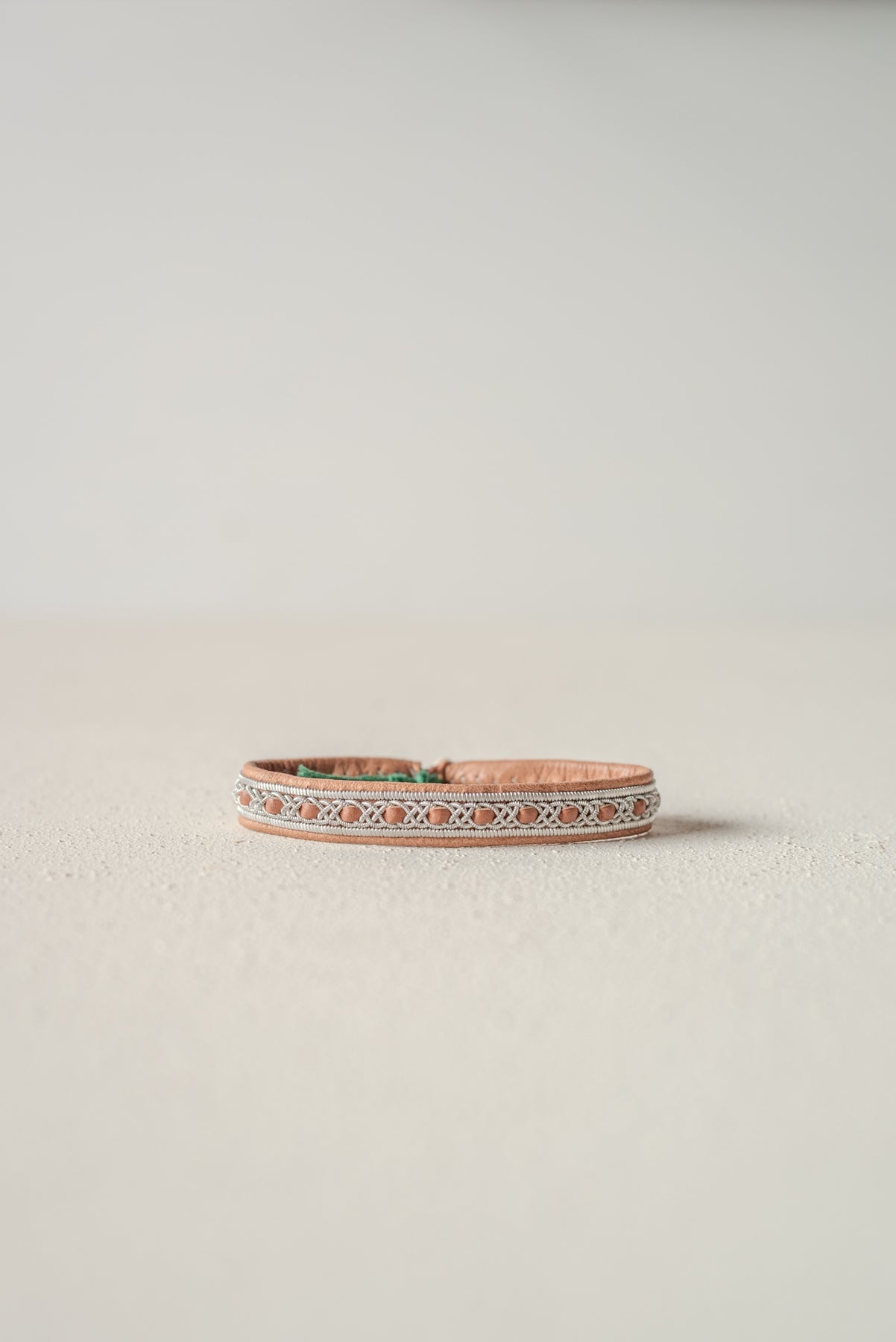 サーミ人の伝統技術を受け継ぎ、丁寧に作られた特別なブレスレットです。トナカイ革に施された刺繍は、熟練の職人による手作業で、一つひとつ美しく仕上げられています。